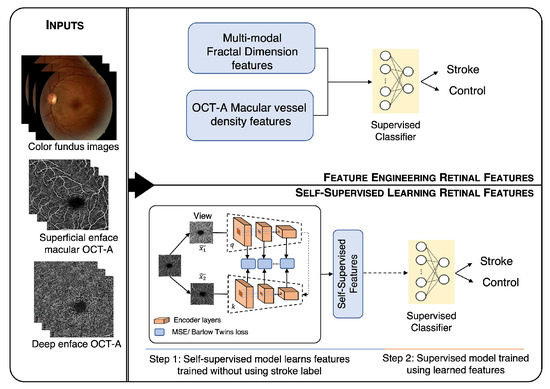 Figure 1 shows the overall workflow of the proposed method. The workflow shows two methodologies, (1) feature engineering (above) and (2) self-supervised learning (below). The color fundus, superficial, and deep enface OCT-A images were used as the input for both the approaches. The features obtained from the feature engineering and self-supervised learning approach were finally given to the supervised classifiers for stroke vs. control classification.
