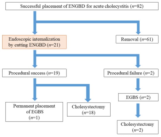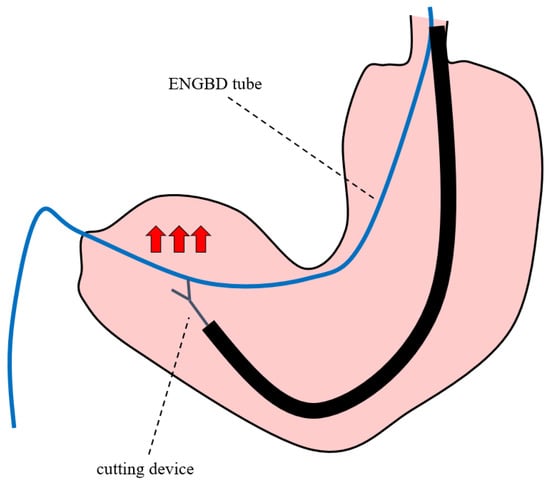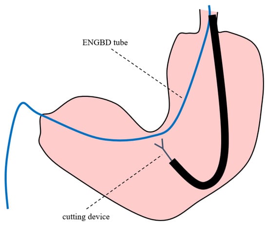 Percutaneous transhepatic gallbladder drainage (PTGBD) has traditionally been performed to drain the gallbladder and control infection [,,]. However, PTGBD is contraindicated in patients with massive ascites, coagulopathy, or percutaneous inaccessible anatomical location of the gallbladder []. Furthermore, the external drainage tube can cause discomfort or pain at the puncture point and can potentially deteriorate the quality of life (QOL) due to limitations in activities of daily living. Endoscopic transpapillary gallbladder drainage (ETGBD) has emerged as an alternative therapy for patients with cholecystitis for whom PTGBD is contraindicated, and there have been multiple reports on the usefulness and safety of ETGBD in patients with acute cholecystitis [,,,,,,,,,,]. ETGBD consists of two types of derange methods: endoscopic nasogallbladder drainage (ENGBD) as an external drainage method and endoscopic gallbladder stenting (EGBS) as an internal drainage method. ENGBD enables monitoring the drainage state, lavage of the gallbladder, and sampling of drainage fluid for bacteriological culture or pathological analysis []. However, ENGBD can cause significant discomfort around the throat and is associated with a high risk of accidental removal of the drainage tube, including self-removal, especially in patients with dementia and disorientation. EGBS is seen to be a more tolerable procedure for patients because of its internal drainage features; however, EGBS does not allow to check the drainage state and has a risk of stent occlusion which can lead to insufficient drainage []. In our centers, the ENGBD tube is endoscopically cut inside the stomach for internalization, as conversion from ENGBD to EGBS after improvement of cholecystitis, if necessary. We conducted this study to evaluate the feasibility, efficacy, and safety of endoscopic internalization by cutting an ENGBD tube in the management of acute cholecystitis.