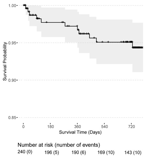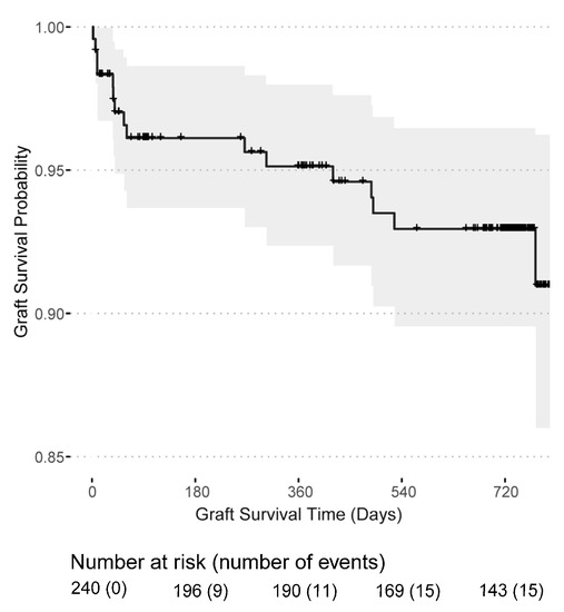 Post-transplant dialysis was required in 90 (37.34%) patients and 9 (3.73%) patients remained with a non-functioning kidney graft, see Table 1. Surgical kidney graft removal was necessary in two transplant recipients, whereas the majority had an immunological graft loss. Graft losses occurred mainly in the first year (11 out of 16) after transplantation and two patients experienced a graft loss shortly before death. The death-censored graft survival probability was 95.1% (95% CI: 92.4–98.0%) in the first year and 92.9% (95% CI: 89.5–96.5%) in the second year after transplantation (Figure 3). Likewise, the mortality rate was highest in the first year after transplantation with a patient survival probability of 96.7% (95% CI: 94.3–99.1%) in the first year and 94.3% (95% CI: 91.1–97.7%) in the second year (Figure 4). In total, 16 kidney grafts were lost, and 12 transplant recipients died. Overall, 50 patients were lost to follow-up.