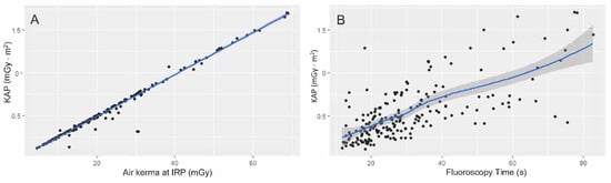 Linear regression of air kerma at IRP with KAP (A) and fluoroscopy time with KAP (B). A positive linear association was observed in both cases.