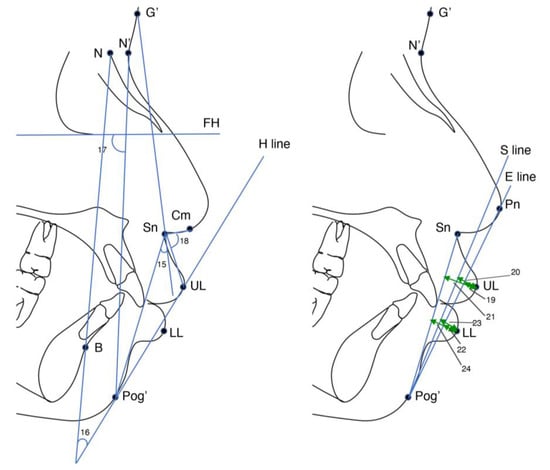 All lateral cephalograms were taken in the natural head position with the lips at rest and the teeth positioned in centric occlusion. The cephalograms were digitised using Dolphin Imaging Software version 11.5 (Dolphin Imaging and Management Solutions, Patterson Dental Supply, Inc., Chatsworth, CA, USA). Twenty landmarks were defined on each cephalogram, and eight skeletal, six dental, and ten soft tissue variables were measured (Figure 1 and Figure 2). The definitions of skeletal, dental, and soft tissue measurements are shown in Table 1.