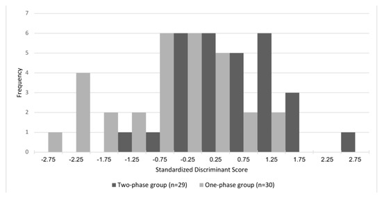 Standardised discriminant scores of the two-phase and one-phase group. Patients in the two-phase treatment group tended to have more positive discriminant scores, whereas patients in the one-phase treatment group tended to have more negative discriminant scores.