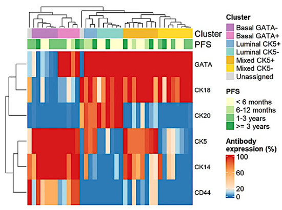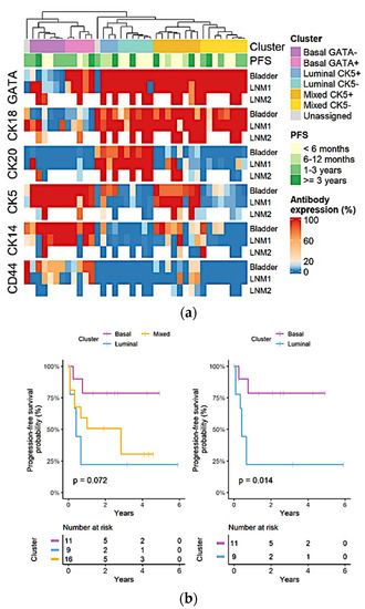 - Choi, W.; Porten, S.; Kim, S.; Willis, D.; Plimack, E.R.; Hoffman-Censits, J.; Roth, B.; Cheng, T.; Tran, M.; Lee, I.L.; et al. Identification of distinct basal and luminal subtypes of muscle-invasive bladder cancer with different sensitivities to frontline chemotherapy. Cancer Cell 2014, 25, 152–165. [Google Scholar] [CrossRef]