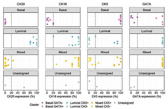 - Guo, C.C.; Bondaruk, J.; Yao, H.; Wang, Z.; Zhang, L.; Lee, S.; Lee, J.G.; Cogdell, D.; Zhang, M.; Yang, G.; et al. Assessment of Luminal and Basal Phenotypes in Bladder Cancer. Sci. Rep. 2020, 10, 9743. [Google Scholar] [CrossRef] [PubMed]