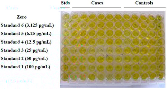 IL17A cytokine was measured by the Sandwich Human IL17A ELISA kit (Diaclone, Cat. No. 850940096, Besancon, France) following the manufacturer’s instructions (Figure 3). Standards (serially diluted), diluted samples (patient and control), and zero (standard diluent buffer 1X) 100 μL each were added to their corresponding wells. The wells were covered with a plastic cover and incubated for 2 h at room temperature (18–25 °C), followed by washing each well with 300 μL of 1X wash buffer 3 times in an automatic washer (LabLife, Germany). Subsequently, diluted biotinylated antibody (50 μL) was added to each well, and the plate was incubated for 1 h at room temperature, followed by washing (similar to the first washing). After washing, diluted Streptavidin-HRP (100 μL) was dispensed into each well, and again the plate was incubated at room temperature for 30 minutes and subsequently washed 3 times (similar to the first washing). TMB substrate (100 μL) was added to each well, and the plate was incubated in the dark for 5–15 minutes to develop color. The substrate reaction was stopped by adding H2SO4 stop reagent (100 μL) to each well. The absorbance value (OD) of each well was determined at the wavelength of 450 nm in a Tri-Star multimode reader (Berthold, Germany) with ICE software, immediately after adding the stop solution.