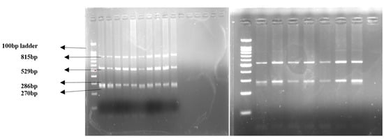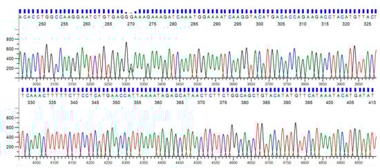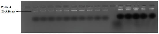 Whole DNA was extracted from blood samples with the DNA extraction kit (Sigma-Aldrich, St. Louis, MO, USA) following the manufacturer’s instructions to obtain purified and high-quality genomic DNA. The extracted DNA was subjected to agarose gel electrophoresis (Tanon, China), and the DNA bands obtained (Figure 4) were observed by the gel-documentation system (Aplegen, Pleasanton, CA, USA). Moreover, the concentration and the purity were measured by Nanodrop2000 (Thermo Scientific, Waltham, MA, USA). The elute containing pure genomic DNA was stored at −80 °C until further analysis.