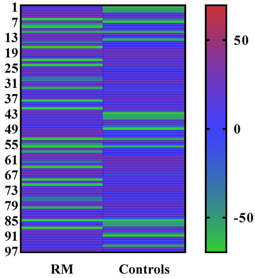 The serum levels of IL17A cytokine in both RM patients and the control group were quantified with the Human IL17A ELISA kit following the manufacturer’s guidelines. A standard linear curve was generated by plotting the OD of each standard on the y-axis and their corresponding known concentrations on the x-axis in Microsoft Excel (version 12.0). The unknown concentration of each sample was measured by extrapolating their OD values against the known standard concentrations of IL17A using the standard curve. The average levels of IL17A in both groups are demonstrated in Table 2. The average concentration of IL17A decreased in RM patients compared with the control group. The color presentation of the IL17A concentration of each sample was demonstrated in the heat map plot (Figure 5). However, the difference between the levels of IL17A in the RM and control groups was not statistically significant (p > 0.5) (Figure 6). The diagnostic potential of IL17A for this disease was assessed by the plotting ROC (receiver-operating characteristic) curve (Figure 7).