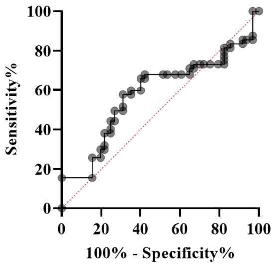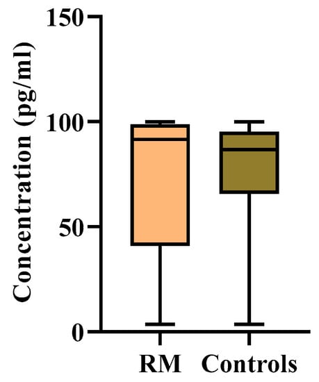 In this study, we also assessed the diagnostic potential of IL17A for this disease by plotting the ROC curve. However, it was found that IL17A had no discriminatory diagnostic potential for RM on the basis of the AUC (area under the ROC curve) (area (CI 95%); p-value = 0.584 (0.502–0.666); 0.0424). The overall diagnostic precision of the test may be effectively summarized using AUC. AUC measures discrimination and allows the diagnostic performances of two tests to be compared []. It accepts values ranging from 0 to 1, 0 indicating a perfectly incorrect test and 1 indicating a perfectly accurate test []. Generally speaking, an AUC of 0.5 indicates no discrimination (i.e., the ability to diagnose individuals with and without the disease or condition based on the test), 0.7 to 0.8 is regarded as satisfactory, 0.8 to 0.9 is considered excellent, and more than 0.9 is considered remarkable []. In our study, the AUC obtained for IL17A was 0.584. Therefore, IL17A cannot be used as a significant diagnostic marker for RM, because its distributional difference between the patient and control groups is insignificant.