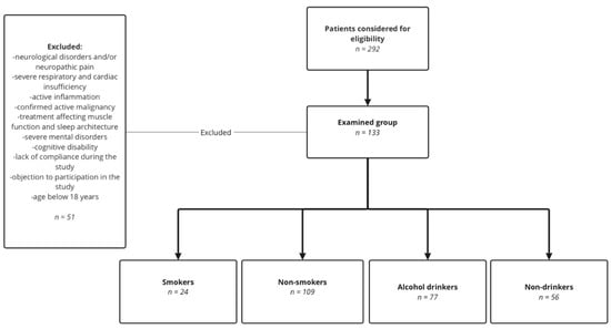 Among 292 patients admitted to the Sleep Laboratory due to suspicion of SB and/or sleep apnea between May 2020 and December 2021, 133 patients were included in the study group based on the following inclusion and exclusion criteria. The inclusion criteria included adults over 18 years of age and the provision of voluntary informed consent to be part of this study. The exclusion criteria were as follows: presence of neurological disorders and/or neuropathic pain, severe respiratory and cardiac insufficiency, active inflammation, confirmed active malignancy, treatments affecting muscle function and sleep architecture, severe mental disorders, cognitive disability, and lack of compliance during the study. The study design is presented in Figure 1.