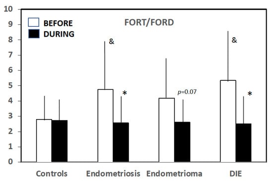In control women, hormonal contraceptives increased both FORT (0.98 ± 0.93; p = 0.003) and FORD (0.416 ± 0.63; p = 0.012), and the FORT/FORD ratio remained stable (0.07 ± 1.34; p = 0.810) (Table 3) (Figure 1). In women with endometriosis, however, FORT remained stable (−0.15 ± 1.4; p = 0.457), while FORD increased (0.311 ± 0.72; p = 0.004), leading to a significant decrease in the FORT/FORD ratio (−2.24 ± 4.8; p = 0.002). This effect was significant for women with DIE (−2.80 ± 4.9; p = 0.011) and close to significance in the Endometrioma group (−1.75 ± 4.6; p = 0.068) (Table 4) (Figure 1).