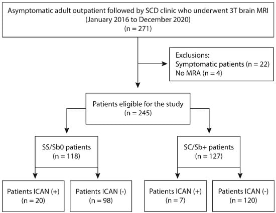 Flowchart of patients included in the study. SCD: Sickle cell disease; MRI: Magnetic resonance imaging; ICAN: intracranial aneurysm; SS/Sb0 = SS/S-β0thalassemia genotype; SC/Sb+ = SC/S-β+ genotypes.