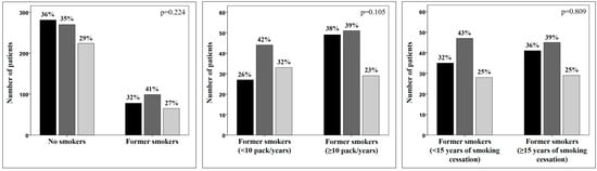 In the former smokers subgroup, the pre- and post-FEV1/FVC was significantly lower; no other significant differences could be described regarding the other functional variables and clinical outcomes including exacerbations, emergency department admissions, and hospitalizations in the previous year. Asthma control test (ACT) was as well comparable in never smokers and former smokers. The same findings were confirmed when stratifying the former smokers by pack-years and length of smoking cessation. When considering the overall asthma control in terms of clinical assessment according to GINA recommendations (Figure 1), the proportion of not-controlled, partially controlled, and controlled patients is comparable in never and former smokers; furthermore, the number of pack-years within the former smokers subgroup is not relevant.