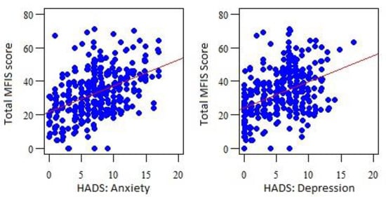 The HADS for anxiety and depression were found to correlate significantly and positively with the total MFIS score and with the scores on each of its subscales, which indicates that the higher the HADS score, the greater the value in the MFIS (Table 5 and Figure 1).