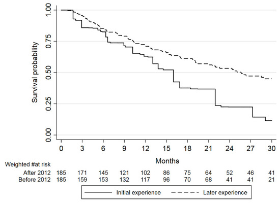 With balanced covariates, the median OS of the patients treated before 2012 increased to 16 months (IQR:.6.6–21.9). The median OS of the patients treated from 2012 onward remained 25.7 months, providing an adjusted HR of 0.53 (95% CI: 0.41–0.67) for the most recent period (Figure 1; p = 0.001).