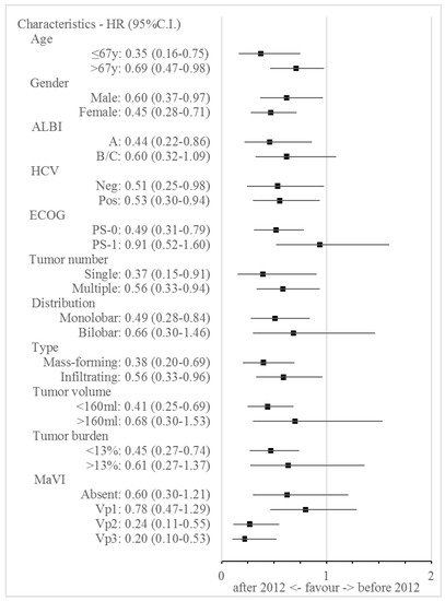 In determining OS, the interaction effect between the reweighted clinical variables and the treatment period (Figure 2) suggested the improved efficacy of TARE for the majority of clinical situations, with the exception of patients belonging to ALBI class B/C (p = 0.194), those with an ECOG–PS score of 1 (p = 0.750), those with larger (p = 0.347) and bilobar tumours (p = 0.308) having a tumour burden of >13% of the total liver volume (p = 0.229). No improvement was observed in patients without MaVI (p = 0.153) or in those with portal vein 1 (Vp1) neoplastic invasion (p = 0.325).