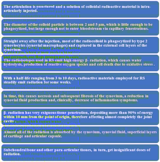 Articular bleeds cause chondrocyte death and chronic hemophilia synovitis (CHS) resulting in a malicious circle of synovitis-hemartrosis-synovitis. This circle has to be broken quickly to halt or slow the appearance of hemophilic arthropathy. The hypertrophied synovium can be detected through palpation as a hard mass. Removal of the hypertrophied synovial membrane may be performed by using radioisotopes [,,,,,,,,,,,,]. Figure 1 summarizes the mechanism of action of radioactive materials injected intra-articularly (radiosynovectomy-RS) [,,,].
