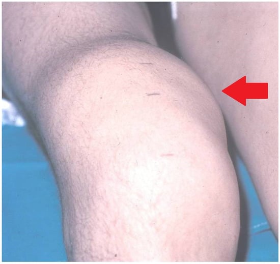 Serious chronic hemophilia synovitis (CHS) in a hemophilic patient (arrow).