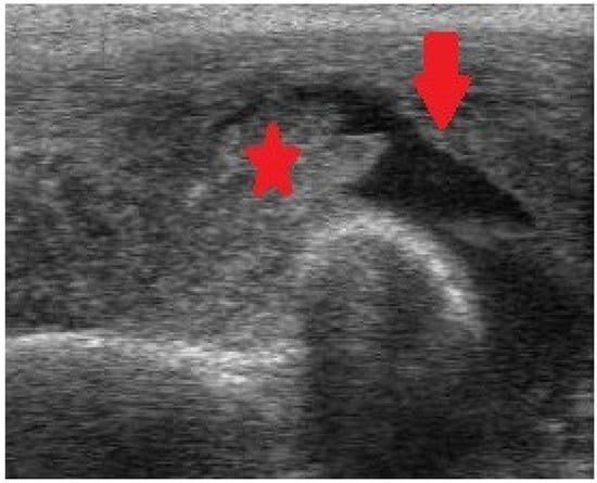 Ultrasonography (US) of the elbow exhibiting intraarticular fluid (arrow) and intense synovial enlargement (asterisk).