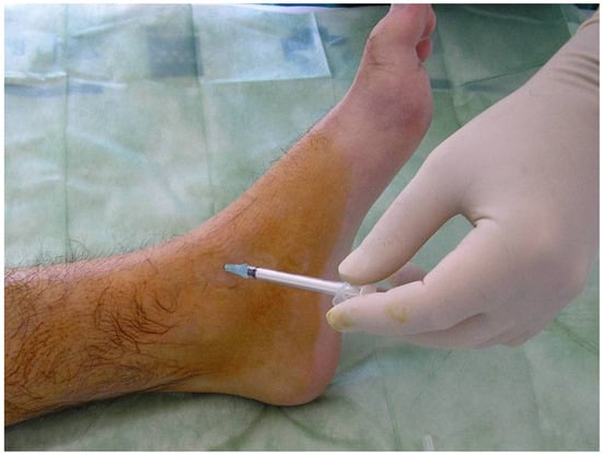We do not use local anesthetic. An ordinary needle is sufficient. When the joint has been accessed, all the fluid (blood or synovial fluid) is evacuated, and only then the radioisotope is introduced. The needle must be removed gradually whilst simultaneously introducing an anti-inflammatory agent (e.g., betamethasone), so as to not cause skin burn. Figure 5 shows the technique and all the elements required for ankle RS.