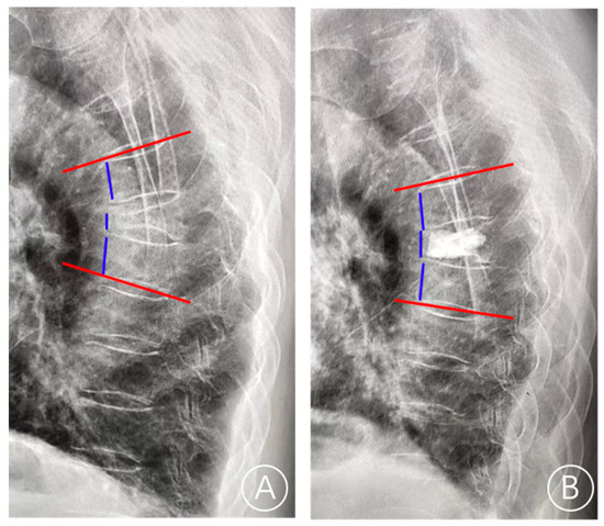 The lateral radiograph showed the measurement of the anterior vertebral height and the local Cobb angle. (A) On the preoperative lateral radiographs, the anterior height of the fractured vertebra, the upper adjacent vertebral anterior height, the lower adjacent vertebral anterior height, and the Cobb angle were measured. (B) On the postoperative lateral radiographs, the anterior height of the fractured vertebra, the upper adjacent vertebral anterior height, the lower adjacent vertebral anterior height, and the Cobb angle were measured. The red line is the endplate and the blue line is the anterior vertebral height.