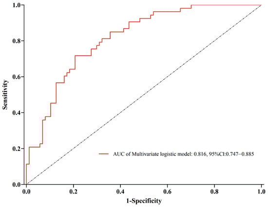 In the logistic regression analysis, the risk factors of bone cement displacement included thoracolumbar junction (odds ratio (OR) = 3.23, 95% confidence interval (CI) 2.12–4.50, p = 0.011), Kümmell’s disease staging (OR = 2.23, 95% CI 1.81–3.41, p < 0.001), anterior cortex defect (OR = 5.34, 95% CI 3.53–7.21, p < 0.001), endplates defect (OR = 0.54, 95% CI 0.35–0.71, p < 0.001), cement distribution (OR = 2.86, 95% CI 2.03–3.52, p = 0.002), cement leakage (OR = 4.59, 95% CI 3.85–5.72, p < 0.001), restoration of the local Cobb angle (OR = 3.17, 95% CI 2.40–5.73, p = 0.024), and postoperative anti-osteoporosis treatment (OR = 0.48, 95% CI 0.18–0.72, p = 0.025) were independently associated with the bone cement displacement following PVA (Table 3 and Figure 4). The results of ROC curve analysis showed that the AUC of these independent influencing factors for predicting bone cement displacement after PVA in Kümmell’s disease was 0.816 (95% CI 0.747–0.885), the sensitivity was 0.717, and the specificity was 0.793 (Figure 5).