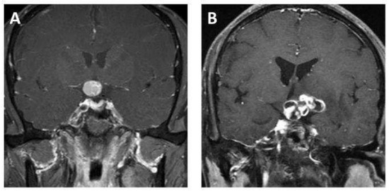 Representative contrast-enhanced T1-weighted MR images of (A) adamantinomatous craniopharyngioma and (B) papillary craniopharyngioma.