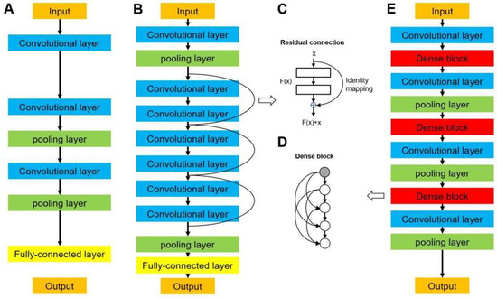 Network architectures of (A) a typical convolutional neural network, (B) a residual neural network (ResNet), and (E) a densely connected convolutional network (DenseNet). (C) Residual connection building block in ResNet. (D) Densely connected dense block in DenseNet.