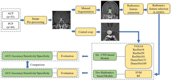 The recent development of genomics allows clinicians to explore a more individualized method for craniopharyngioma treatment and prognostic prediction. It has been identified that the CTNNB1 mutation is mostly associated with ACP, while PCPs frequently harbor the somatic BRAF-V600E mutation [7,8,9]. A targeted therapy harboring BRAF-V600E is therefore viable for PCP treatment, and it has been reported to be feasible in several individual cases [10,11,12,13]. Moreover, PCP tends to present a higher overall expression of PD-L1 than ACP, which seems to be associated with the BRAF mutation, and may have a favorable response to anti-PD-L1 therapy [14]. Therefore, a combination of targeting PD-L1 and a BRAF inhibitor is an attractive potential therapy for PCP patients [6,15]. Overall, given these progresses in individualized treatment and the distinction in patient prognosis, molecular diagnosis before treatment is rather clinically relevant and should be explored. Lacking specific clinical symptom or blood biomarkers, magnetic resonance imaging (MRI) is the standard as well as the most important preoperative assessment of craniopharyngioma. On T1-weighted images (T1WI), a lobulated, hyperintense, cystic appearance is commonly observed in ACP, while a spherical, hypointense, solid appearance with cysts is observed in PCP [16]. However, the differentiation of ACP and PCP based on above image characteristics is subjective and inadequate, especially for adult patients [16,17]. Nowadays, a series of artificial intelligence (AI) models have been built to assist radiologists and have shown gratifying results in lesion detection, segmentation, diagnosis, and genetic prediction [18,19,20,21]. Previously, several machine learning models built with selected radiomics features were used to discriminate ACP from PCP and to estimate the BRAF and CTNNB1 mutation statuses in craniopharyngioma [22,23,24] although the results were laborious, as they required radiomics features extracted from manual segmentation and a selection of appropriate features [25,26]. Convolutional neural networks (CNNs), a class of deep learning technology, allow for the automatic recognition of important features for detection or classification through multiple layers of representations in raw data [27,28]. Thus, an automated end-to-end approach based on deep learning technology requiring no human involvement should be investigated. In this study, we retrospectively analyzed the clinical and MRI characteristics of ACP and PCP in adult patients. Moreover, we developed a series of CNN models to automatically discriminate ACP from PCP using routine MRIs and tested their performance with classical radiomics methods.