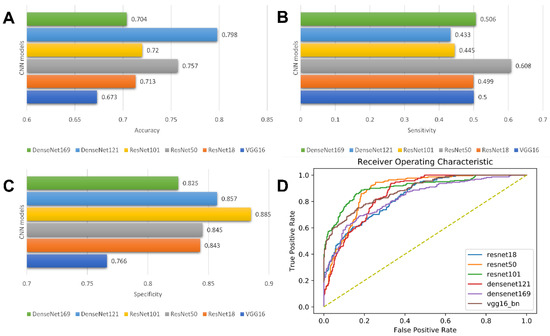 Model performance of CNN models. Bar charts of accuracy (A), sensitivity (B), and specificity (C); Receiver operating characteristic (ROC) curves of CNN models (D).