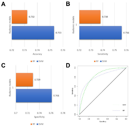 Performance of radiomics models. Bar charts of accuracy (A), sensitivity (B), and specificity (C); Receiver operating characteristic (ROC) curves of radiomics models (D).