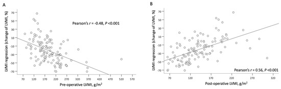 Preoperative LVMI is inversely proportional to relative LVMI regression (A) and postoperative LVMI is directly proportional to relative LVMI regression (B).