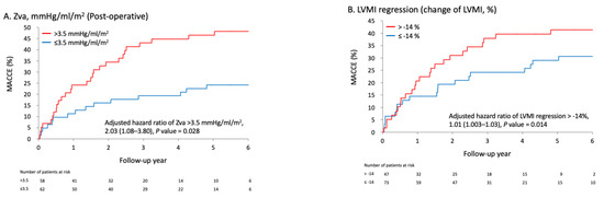 The cumulative event rates of MACCE for patients with higher (>3.5 mmHg/mL/m2) and lower (≤3.5 mmHg/mL/m2) postoperative ZVA are shown in (A). The corresponding optimal cutoff of relative LVM regression was 14%; the cumulative event rates against the cutoff are shown in (B).