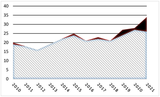 Characteristics of the cohort: Thirty-seven reports were scrutinized for a possible relationship between IMD onset and vaccination. Three reports were excluded due to inconsistent temporal relationships. Four patients (Sjögren’s syndrome, systemic lupus, sarcoidosis, PMR), who reported self-limited inflammatory musculoskeletal or dermatological (sarcoidosis) manifestations soon after vaccination, were also excluded. Thirty post-vaccine disorders qualifying as IMDs were recorded within the study timeframe, 27 of which (90%; 22 new onset, 4 relapses) occurred after COVID-19 vaccination. These comprised 12 cases of GCA, four of PMR (one relapse), three of necrotizing myositis or acute rhabdomyolysis, three of systemic vasculitis (one EGPA, two SHP), two of ITP, and one each of relapsed rheumatoid arthritis, relapsed AOSD, and PL7-positive anti-synthetase syndrome with interstitial lung disease (ILD). Three other vaccine-induced IMDs were diagnosed within the study timeframe—two cases of GCA following seasonal influenza vaccination and a PMR following a second pneumococcal vaccination. Table 1 summarizes the demographics, diagnoses, COVID-19 vaccines, treatments, and outcomes of the patients. The patients’ mean age was 67 years (50–90 years), and 15 (56%) were women. The causative vaccines were ChAdOx1 (Vaxzevria®, AstraZeneca, Oxford, UK), BNT162b2 (Comirnaty®, Pfizer-BioNTech, New York, NY, USA), and mRNA-1273 (Spikevax®, Moderna, Cambridge, MA, USA) in 7, 18, and 2 patients, respectively. The IMD started after a first vaccine dose in 14 patients (52%), a second dose in seven patients (26%), and a third (booster) dose in six patients (22%). All three patients with acute IMNM, or rhabdomyolysis, had a negative or normal workup including serologic tests for HIV, herpes viruses, HTLV1 + 2, hepatitis A, B, and C, EBV, CMV, parvovirus, serum protein electrophoresis, antinuclear antibody test, anti-ds-DNA, ENA panel, DOT-myositis, C3, C4, rheumatoid factor, and ANCA. They all had widespread muscle inflammation with edema on MRI and a muscle biopsy demonstrating IMNM. Of the 12 GCA cases, nine were biopsy-proven. The delay between vaccination and GCA onset averaged 6 days (2–20 days). Three patients had permanent visual loss (two at diagnosis, one during an early relapse), bilaterally in one. All but three of the patients presented with an ESR > 60 mm/h (mean 92 mm/h) and a CRP level > 7 mg/dL (mean 12.3 mg/dL). The incidence of GCA in 2021 was higher than expected even after taking account of an upward trend (Figure 1).
