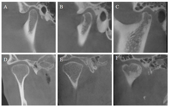 Before assessment, the DICOM data were imported into Dolphin software (Version 11.8; Dolphin Imaging & Management Solutions; Chatsworth, CA, USA) and the head positions were three-dimensionally reoriented with the Frankfort plane parallel to the ground. Then, the CBCT images without participant information were analyzed blindly under identical conditions. After a two-week interval, CBCT images were blindly analyzed by the same operator for the second time. The differences between the two analyses were marked out and discussed with an expert to confirm the results. According to previous research [10,24], the condyle morphology was divided into three subtypes: normal, articular surface flattening, and condylar bony deformation due to subcortical cyst, surface erosion, osteophyte, or generalized sclerosis (Figure 1).