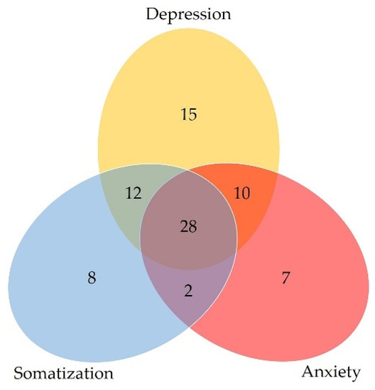 The PHQ-9, PHQ-15 and GAD-7 scores were analyzed, and we found that 42.05% of all the participants had at least one psychological problem. The numbers and percentages of participants with depression, somatization, and anxiety are listed in Table 3 and displayed in Figure 2.