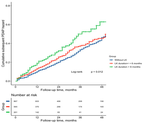 During the median follow-up of 28 months (IQR, 12–47 months), 420 (25.7%) patients were identified with subsequent PDAP started in the second year and later (0.15 episodes per patient-year). The subsequent PDAP rate was 0.17 episodes per patient-year in hypokalemic patients, which was higher than that in the non-hypokalemic group (0.14 episodes per patient-year). As shown in Table 2, LK duration in the first PD year was positively associated with a subsequent PDAP risk (per 3-month increments: adjusted HR, 1.13; 95%CI, 1.05–1.23, p = 0.002). Consistently, compared to patients without LK (LK duration = 0), the subsequent PDAP risk was significantly higher, with HR of 1.53 (95%CI, 1.14–2.06, p = 0.005), in those with LK duration for more than 6 months (Table 2). In the competing risk model, LK duration in the first PD year was still positively associated with subsequent PDAP risk when considering death, kidney transplantation, and HD transfer as competing events. A similar trend was found for SLK duration (per 3-month increments, adjusted HR, 1.19; 95%CI: 1.02–1.38, p = 0.027) (Table 2). Additionally, the Kaplan–Meier curve of the cumulative event rate of subsequent PDAP within each LK duration strata is shown in Figure 2.