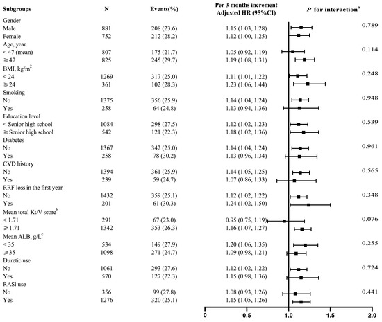 To better understand other possible influencing factors in the relationship between LK duration in the first PD year and risk of subsequent PDAP started in the second year and later, further exploratory subgroup analyses were conducted. None of the variables, including gender (male vs. female), age (<47 vs. ≥47 years), BMI (<24 vs. ≥24 kg/m2), smoking (no vs. yes), education level (<senior high school vs. ≥senior high school), diabetes (no vs. yes), CVD history (no vs. yes), RRF loss in the first year (no vs. yes), mean total Kt/V score (<1.71 vs. ≥1.71), mean ALB (<35 vs. ≥35 g/L), diuretic use (no vs. yes), as well as RASi use(no vs. yes) significantly modified the association between LK duration in the first year and subsequent PDAP risk (all p-interactions > 0.05) (Figure 3).