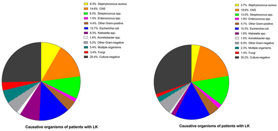 The causative organisms after patient stratification according to the presence of LK are presented in Table 3 and Figure 4. Gram-positive bacteria were the predominant pathogen in the whole cohort. Of the 420 episodes of subsequent PDAP, 168 (40.0%) were due to Gram-positive organisms, 109 (25.9%) episodes were caused by Gram-negative germs, 10 (2.4%) episodes were due to fungi, and 16 (3.8%) to multiple organisms. Culture-negative results were reported in 117 (27.9%) cases. The most frequent of Gram-positive organisms was coagulase-negative Staphylococcus (CNS) (16.7%), and the most encountered Gram-negative germ was Escherichia coli (59 cases), accounting for 14.0% of the subsequent PDAP episodes. Compared to patients with LK, those without LK presented more than twice the incidence of subsequent staphylococcus aureus-associated PDAP (8.3% vs. 3.7%, p = 0.048). There was no significant difference in the incidence of Enterobacteriaceae-associated PDAP between the LK group and the group without LK.