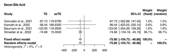 All four studies reported serum bile acid findings at the end-line compared to the baseline (Figure 2). The mean difference was MD = −75.804 (95% CI = −104.726, −46.881). The intervention showed favorable mean reductions in serum bile acid among participants. The findings were significant, with no signs of heterogeneity (p < 0.0001, τ2 = 0, I2 = 0%).