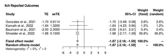 All four studies reported outcomes for the Itch Scale at the end-line (Figure 3). The mean difference was in favor of intervention, with the following values yielded: MD = −1.873 (95% CI = −2.161, −1.585, p < 0.0001). Overall, there was no heterogeneity (τ2 = 0, I2 = 0%), and the findings were significant.