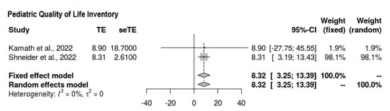 With regard to the findings of the quality-of-life scale assessment, two of the four studies reported outcomes (Figure 5). The overall mean difference was quantified as follows, favoring the intervention: MD = 8.321 (95% CI = 3.255, 13.388). There was no heterogeneity, and the findings were significant (p = 0.0013, Z = 3.22, τ2 = 0, I2 = 0%).
