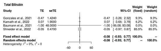 All four studies reported bilirubin outcomes (Figure 7). The mean difference was MD = −0.083 (−0.935, 0.769). Thus, the intervention’s outcomes for total bilirubin did not tend toward any direction. The findings were insignificant, with no heterogeneity present (p = 0.849, τ2 = 0, I2 = 0%).