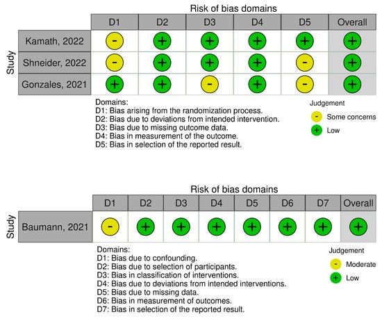 For the randomized trials (n = 3), two studies expressed some concerns about biases arising from the randomization process and in the selection of the reported results, whereas no studies had concerns relating to biases arising from deviations from the intended interventions or to the measurement of the outcomes. One RCT had concerns about bias due to missing outcome data (Figure 8). Overall, all RCTs had a low risk of bias.