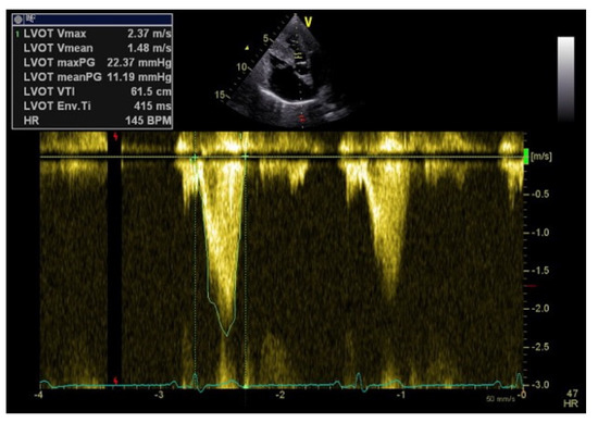 Typical morphological appearance of the Doppler signal “dagger−shaped” and late peaking curve in left ventricular outflow tract obstruction.