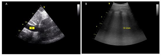Echocardiographic markers of congestion. (A) increased IVC inferior vena cava (IVC) diameter; (B) lung ultrasound showing vertical B-lines as a measure of interstitial oedema.