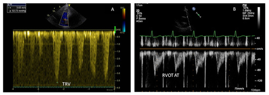 Echocardiographic markers of pulmonary hypertension (PH). (A) Increased peak tricuspid regurgitation velocity (TRV); (B) reduced right ventricular outflow tract (RVOT) acceleration time.