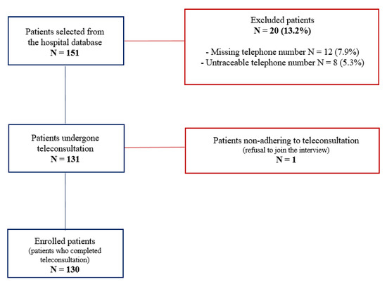 Patients frequently undertaking PCSK9i therapy at the Cardiac Diagnostic Unit of the University of Campania “Luigi Vanvitelli”, and who missed the follow-up visit from 9 March 2020 and 17 May 2020, due to the COVID-19 pandemic lockdown restrictions, were retrospectively selected from the hospital healthcare database. Patients with missing telephone numbers, untraceable patients, and patients who did not give their informed consent were excluded.