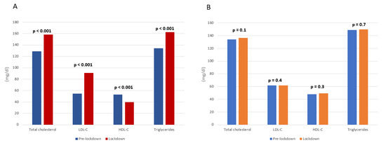 Lipid values changes between pre- and lockdown period in PCSK9i non-adherent (panel (A)) and adherent (panel (B)) group.