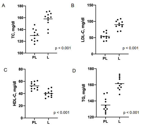 Scatter plots of pre-lockdown (PL) and lockdown (L) lipid values of non-adherent patients. TC: total cholesterol (panel (A)); LDL-C: LDL cholesterol (panel (B)); HDL-C: HDL cholesterol (panel (C)); TG: triglycerides (panel (D)).