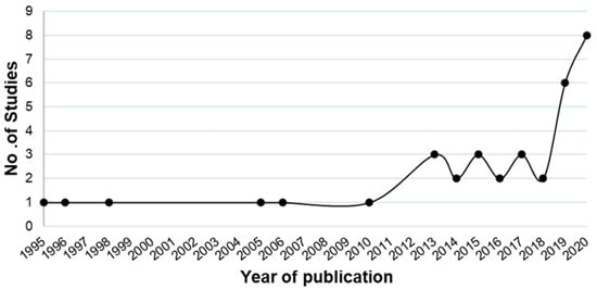 Of the initial literature search, 532 studies were retrieved, and 280 duplicates were omitted. Following review of the title, abstract, and full text, 35 studies were included in the review. There was an increasing trend of machine learning studies in KC published over time (Figure 3), with the earliest study published in 1995 by Maeda et al. [12] and increasing to over 30 studies in 2020.